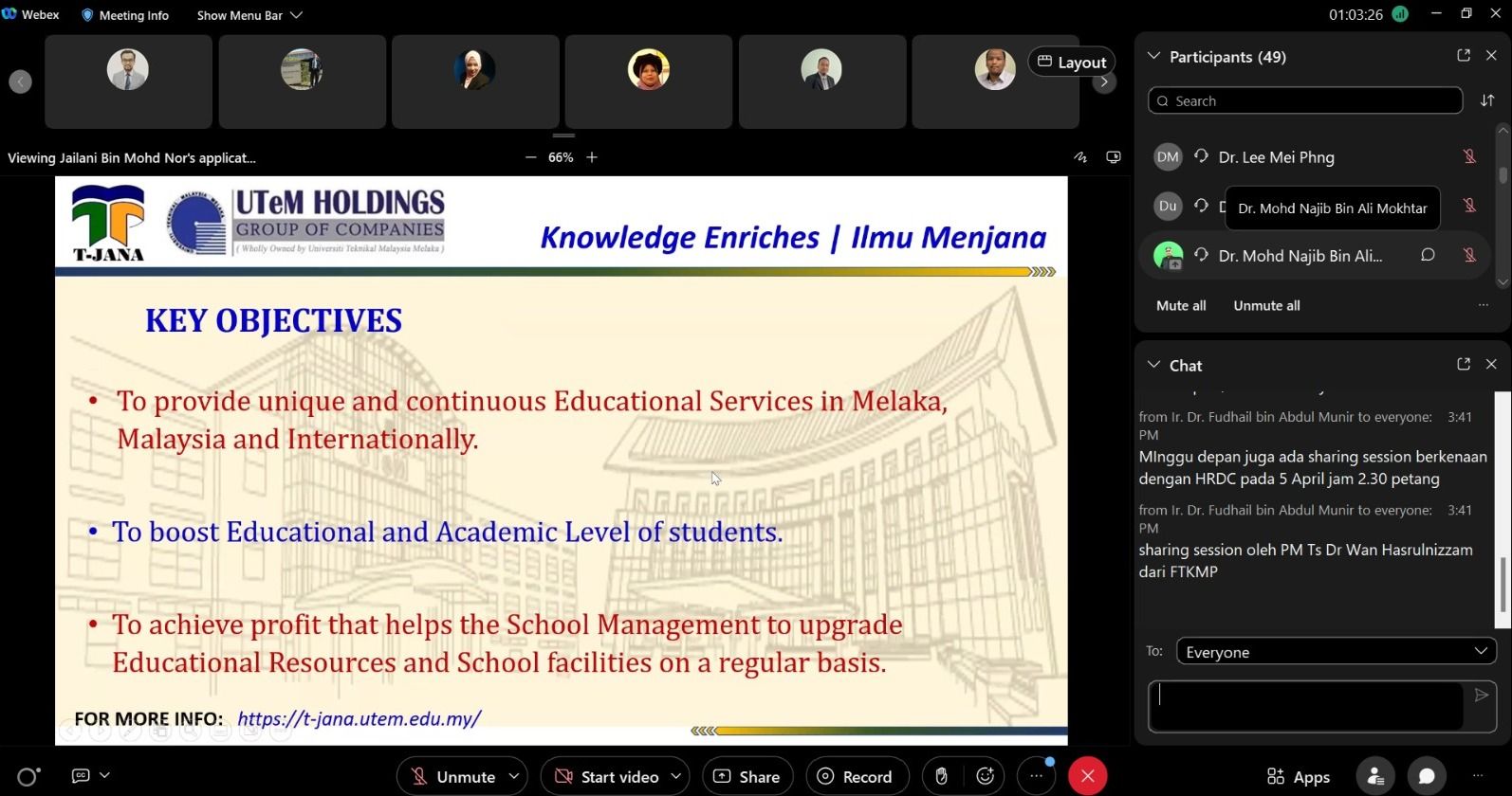 Satu Majlis Lawatan Kerja oleh YB Menteri Pendidikan Tinggi ke UTeM telah diadakan di ruangan makmal FTKMP, Kampus Teknologi UTeM sekitar jam 8:30 am sehingga 11:30 am. T-Jana berpeluang memperkenalkan fungsi T-Jana kepada YB Menteri iaitu DATO’ SERI HAJI MOHAMED KHALED BIN NORDIN. Perbentangan ini telah dibarisi oleh provost T-Jana iaitu Prof.Datuk.Ir.Ts.Dr Mohd Jailani Bin Mohd Nor dan 5 pengarah T-Jana.