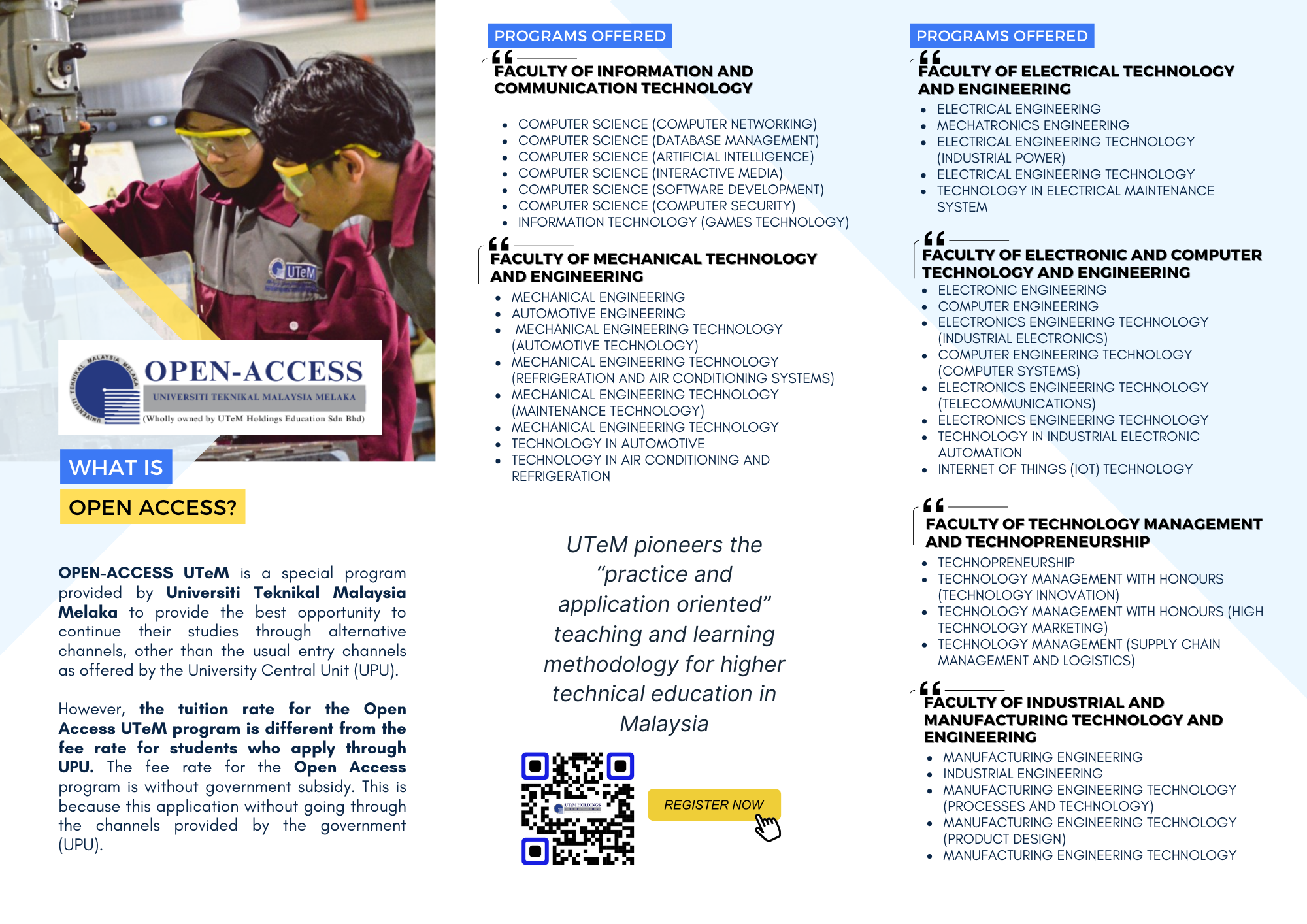 Without any financial aid or tuition exemptions, all study programs provided by Open-Access UTeM are self-funded. Therefore, before beginning their studies, prospective Open-Access UTeM students must submit the FULL FEE.